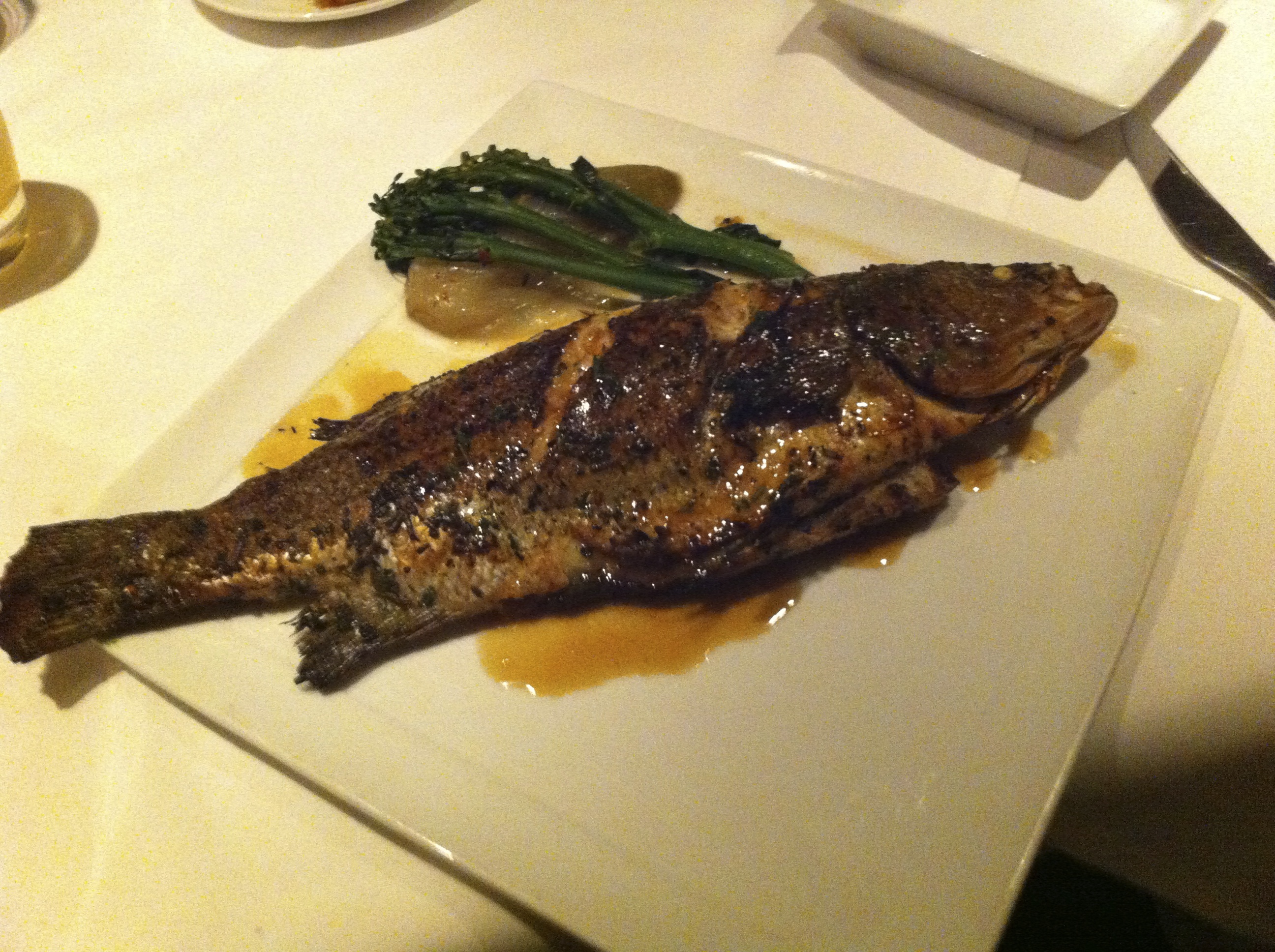 • Whole Fish ($42)Oven roasted striped bass, braised endive, broccollini, lemon parsley sauce