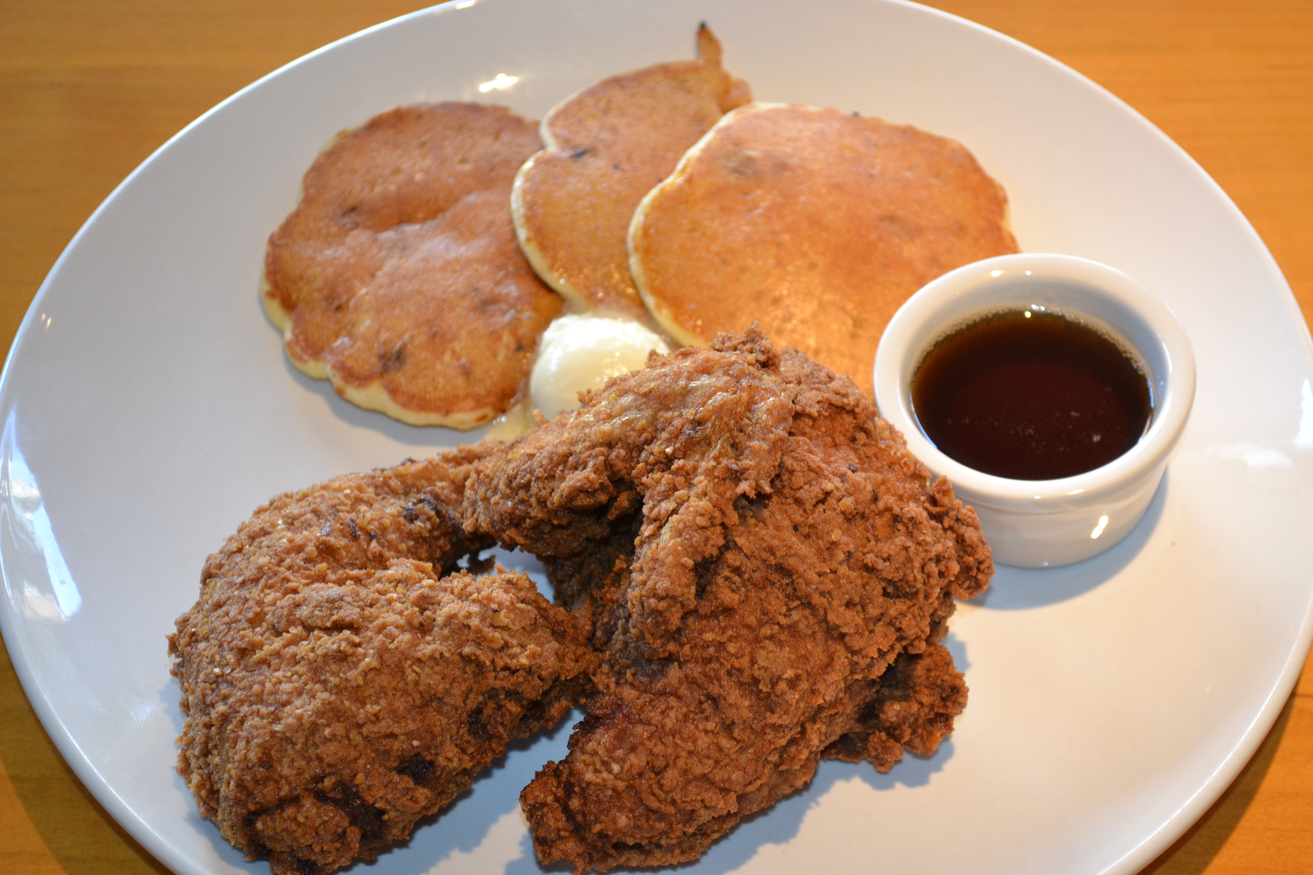 2. Entree-: Was on original menu. The Fried Chickenlooper with Corn Cakes puts a tasty new spin on chicken and waffles. Matzo-breaded chicken accompanied with sweet corn pancakes butter and syrup.