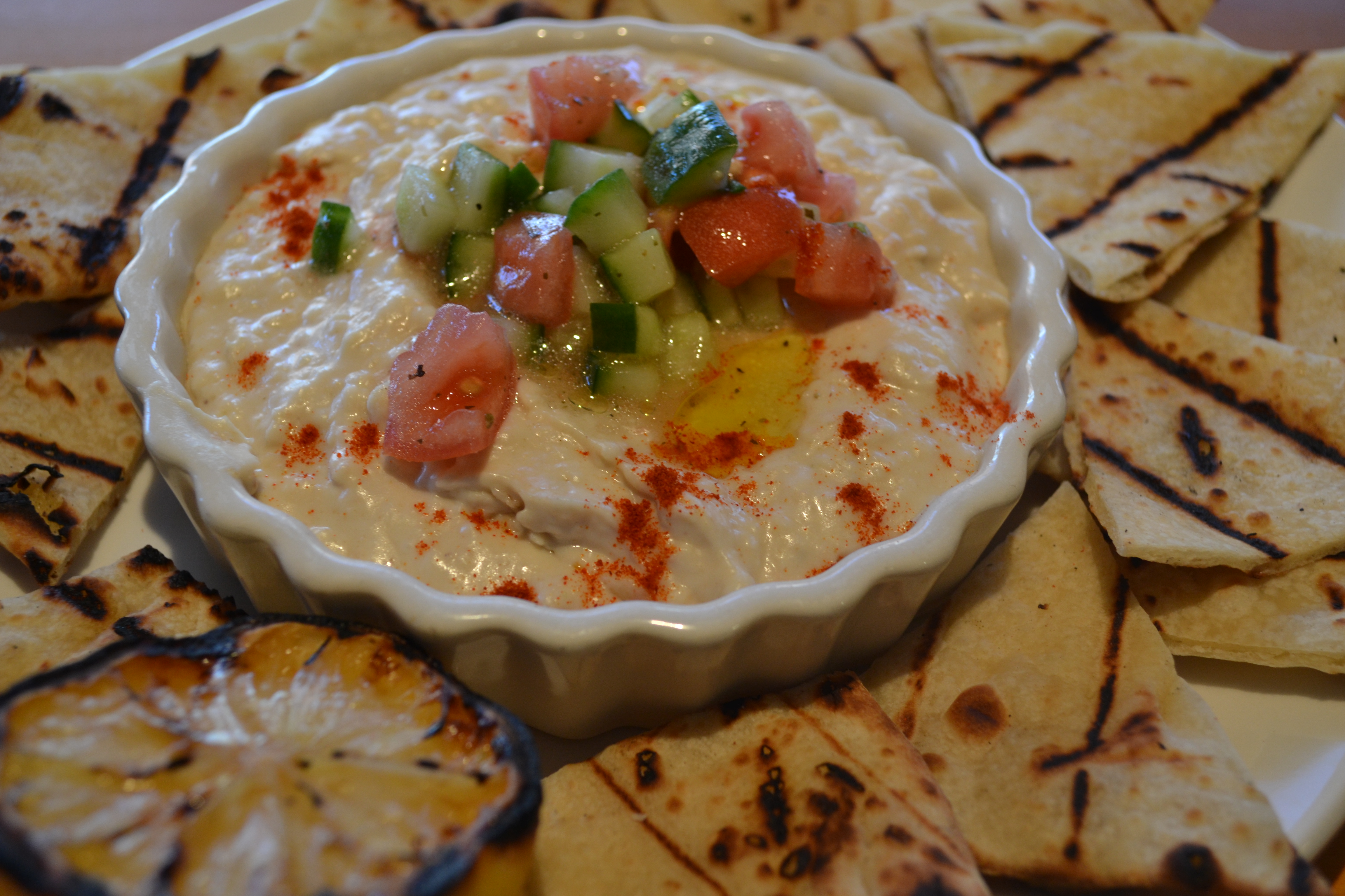 1. Appetizer: their take on hummus The Tuscan White Bean Dip is topped with just enough olive oil for added flavor, topped with marinated cucumbers and tomatoes. Grilled flatbread is on the side.